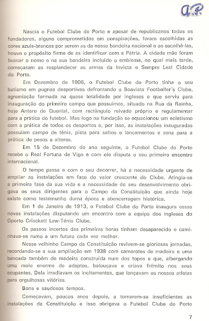 Corriam tempos da infância do autor, numa tarde domingueira de aspeto cinzento. Então, segundo recordo, apenas já me sentia de alguma forma Portista, mas não sabia ainda os nomes da maioria dos jogadores, aliás nem quais eram eles na totalidade, os que envergavam a camisola azul e branca. Tinha na cabeça os que via nos “macacos” da bola, como por aqui pela Longra chamavam aos populares cromos de coleção, figuras em pequenos papeis que vinham a embrulhar rebuçados baratos, dos que meus irmãos mais velhos e seus amigos juntavam e colecionavam em cadernetas. Tendo, daí, ficado na cabeça um jogo que se disputava em Braga, nessa tarde escura, porque, estando eu a brincar nas proximidades de casa com alguns amigos vizinhos e havendo alguém ali por perto a ouvir o relato do futebol, se ia sabendo que o Porto estava sem conseguir ultrapassar um teimoso empate. Então, contra o costume, em que eu normalmente brincava descontraído, dessa vez não me senti muito bem e dei comigo meio tristonho e sem vontade de continuar a brincar.