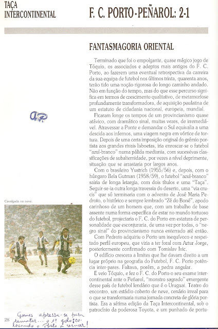 Nas conversas dos mais velhos, por esses tempos, ainda andavam no ar resquícios do campeonato que o F. C. Porto ganhara antes, em 1958/59, coisa de que eu não tinha nem fazia ideia, mas me parecia ter sido há uma infinidade de tempo, na pouca idade entretanto vivida. Ouvindo por isso nomes duns Hernâni, Pedroto, Monteiro da Costa, Teixeira, Arcanjo, etc. mas nem sabia se eram altos ou baixos, brancos ou morenos, até porque nos que apareciam nos jornais, por vezes, via tudo a preto e branco. Por isso, naquela tarde enfadonha, já pelo ano de 1960, fiquei a saber que no Porto havia um tal Humaitá e outros que tais, que não deviam ter pés muito direitos - às bolas que não acertavam na baliza dos outros…