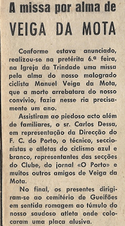 Não sabemos se, de permeio, houve mais algum caso do género, dentro das atividades Portistas em tempos passados, já que este tema do ciclista Veiga da Mota até nos era desconhecido, tendo dele tomado conhecimento há pouco, apenas, nas constantes pesquisas de tudo o que nos entusiasma na dignificação do F C Porto, clube da nossa vida.