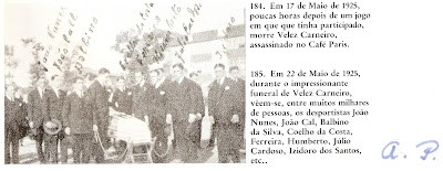 Posto isto, passamos a exemplos acontecidos fora das pugnas desportivas, com elementos ligados ao F C Porto. O primeiro caso passou-se com Vidal Pinheiro, então Tenente e depois Capitão, caído morto em pleno ato de bravura numa batalha durante a 1ª Grande Guerra Mundial de 1914/1918 (a que proximamente aqui dedicaremos espaço mais alargado, num artigo sobre tema da participação do F C Porto em casos militares); depois foi Velez Carneiro, em Maio de 1925, tendo sido morto em condições estranhas, baleado numa rua da cidade do Porto. Dando azo, como figura pública e pessoa muito estimada, que o caso fosse deveras expandido na comunicação social, como se nota por cópia que anexamos, junto com uma imagem ilustrativa de seu acompanhamento fúnebre.