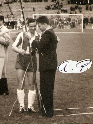 Nota Bene: Agradecemos a gentileza de D. Cecília Pedroto, que nos facultou a fotografia original da festa de homenagem ao então futebolista campeão nacional do F C Porto, o nosso Mestre Pedroto. Mais uma preciosidade de que nos passamos a orgulhar e agradecemos reconhecidos.