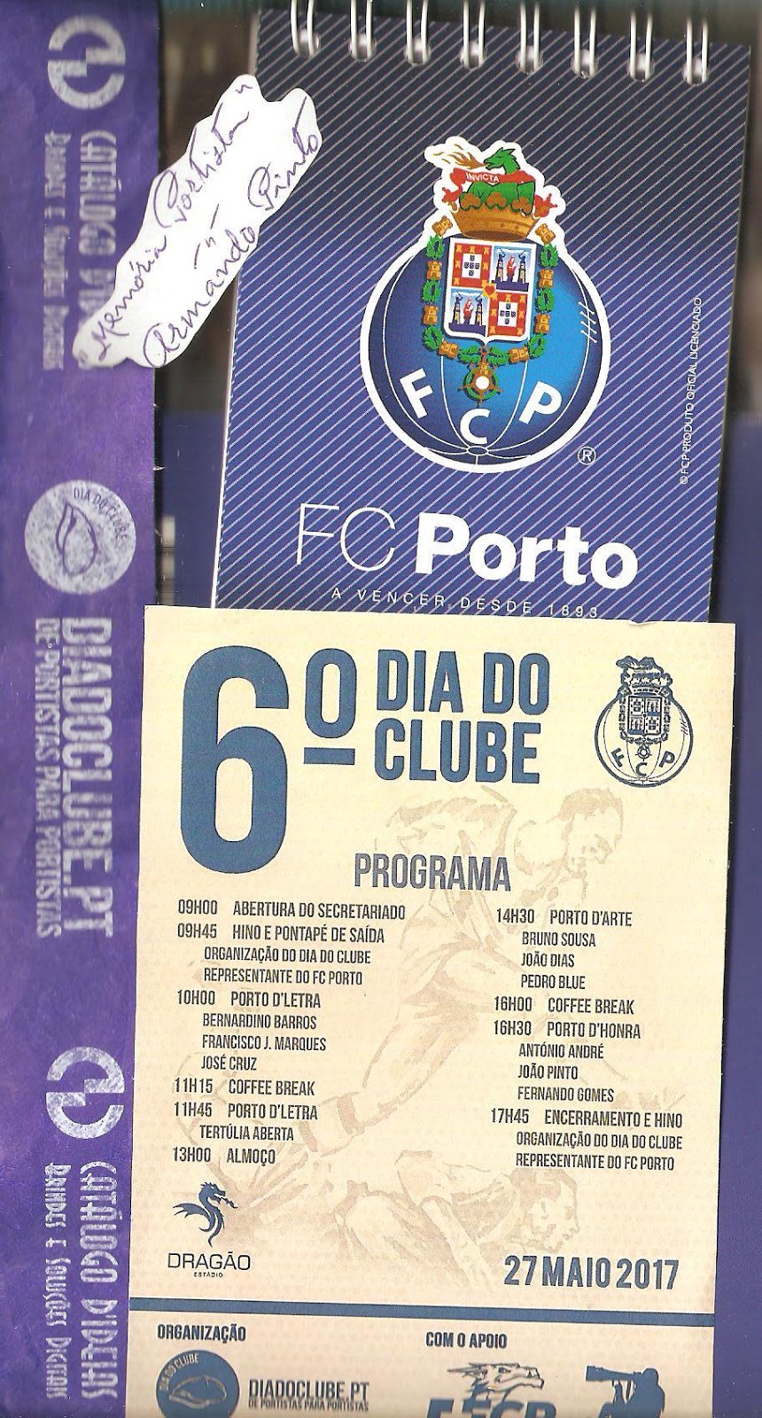 Agregado aquele material literário e diuscográfico às mais lembranças que ficam. Por entre algumas gentilezas recebidas, como dois livros ofertados e com devidas chancelas apostas, porque tudo o que seja referente ao FC Porto nos interessa e motiva. Sem esquecer que a história não pode ser esquecida, porque senão seria sinal de nem ter sido vivida nem ansiar sempre mais e melhor, enquanto tudo vale a pena quando a alma não é pequena, como poetou um dos nossos maiores vates.