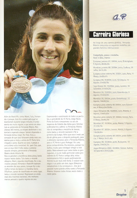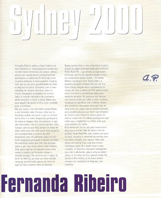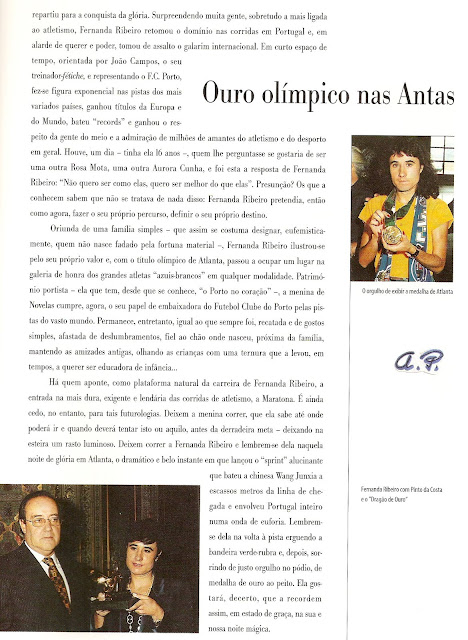 Ora, este ano a representação Portista foi diminuta (como já aludimos em anterior artigo deste blogue), havendo na atualidade menor potencial, embora sem se poder relacionar diretamente, na água pelo menos. Pois o F. C. Porto deixou de correr no atletismo e a natação ainda tem de nadar por piscinas alheias. Perante esse cenário, não será despropositado relembrar algo do passado deste âmbito, quanto ao êxito relevante que tem sido a integração Portista nas embaixadas portuguesas aos Jogos Olímpicos, ao longo da história das Olimpíadas dos séculos XX e XXI. Sem nomear a totalidade dos nomes, nem das presenças, mas apenas alguns casos como exemplos, conforme as crónicas alusivas, a compartilhar. Ao que nos propomos recordar, desta feita, fazendo emergir algumas evocações relacionadas, com a participação clubista (através de imagem duma página acima) e (por respigo doutras páginas, abaixo) a conquista das duas medalhas que fazem parte da memória coletiva Portista, por ora.