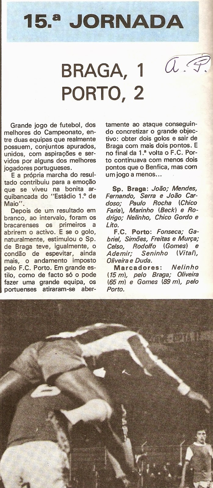 E no campeonato da época seguinte, como me recordo bem e soube melhor, estava à mesma a jogar uma partida de bola com outros amigos (daqueles jogos de mudar aos três e acabar aos seis, que podiam durar até às tantas), quando por um rádio se ia ouvindo a algazarra dum relato radiofónico, doutro jogo que o Porto disputava em Braga. Mas aí, então, tudo correu bem, e, sabendo que os golos foram aparecendo, houve boa disposição. - Pudera… O Porto foi lá e espetou quatro secos, para eles verem como era…!