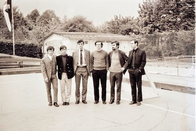 Por esses tempos a equipa era composta pelos elementos integrantes da fotografia junta, ou seja, pela ordem captada (desde cima e da esquerda para a direita), Hernâni Martins, Cristiano, Leite, Magalhães, Fernandes, Castro, Brito e Ricardo, mais (dos que não ficaram nesta foto) uns Júlio, Joel, Rui Caetano, etc. Ainda patinava de stique na mão o “capitão” Alexandre Magalhães (que passaria a ser treinador pouco depois, ficando a orientar a equipa principal do F C Porto a partir do jogo das meias finais contra o Réus de Espanha, num encontro emocionante que o F C Porto venceu por 5-3, depois de ter estado a vencer por 5 sem resposta e cuja recuperação espanhola foi decisiva para o resultado da segunda mão e consequente afastamento da equipa portista).
