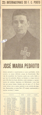 Pedroto, antigo jogador e treinador de futebol, o Mestre Pedroto, nome célebre na história do desporto português e na história do F C Porto de maneira vincada, é naturalmente constante recordação em tudo o que faz vir acima a memória portista, além da saudade sentida pelo que conseguia imprimir na vivência portista; e é e será eternamente memorável em quantos admiraram o seu carisma, como aqui o autor destas linhas de homenagem evocativa.