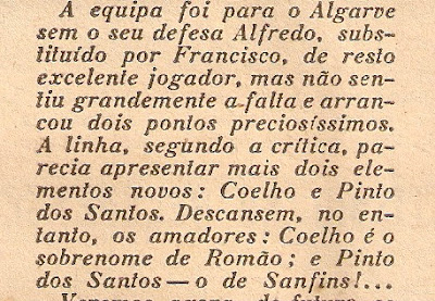 Nesta devoção de evocar tão grande e variada riqueza como é a Memória do F. C. Porto, vem ao caso, então, um jogo disputado ao começo do Outono de 1948, em cuja tarde domingueira de bola (outros tempos…) o F. C. Porto triunfou à justa, com dois golos marcados contra um sofrido. Curiosamente numa volta dada ao marcador, após os anfitriões terem estado a vencer desde o meio da 1ª parte, ripostando os homens das camisolas listadas de azul e branco, através de um golo de Sanfins ao começo da 2ª parte e outro de Araújo quase ao expirar da contenda. Valendo, para o caso, o bom desempenho desses e dos restantes intérpretes da simbologia alvi-anil. Dos quais, para constar, há que referir que por motivos particulares (...) se verificaram algumas mexidas na constituição da linha apresentada, na ocasião. Como foi o caso dum castigo federativo pouco ou nada justo que levou a alterações no setor defensivo, mas nem isso obstou a um bom resultado.